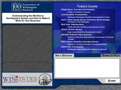 A live webcast interface integrating video, slides, reports, and other elements.